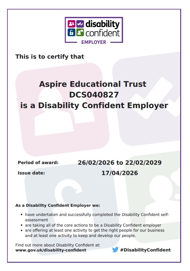 The Aspire Educational Trust is a registered Disability Confident employer. Increasing employee diversity is important to the trust and we are committed to the aims of Disability Confident.